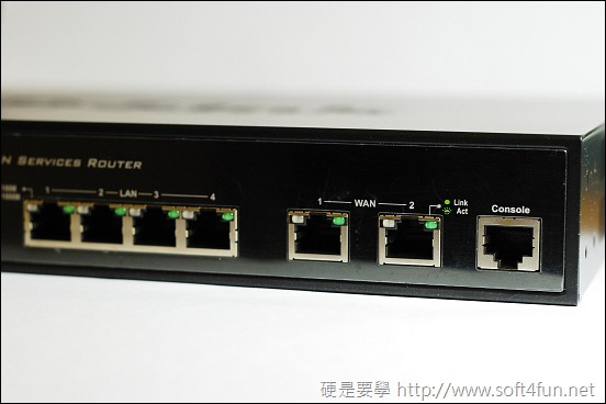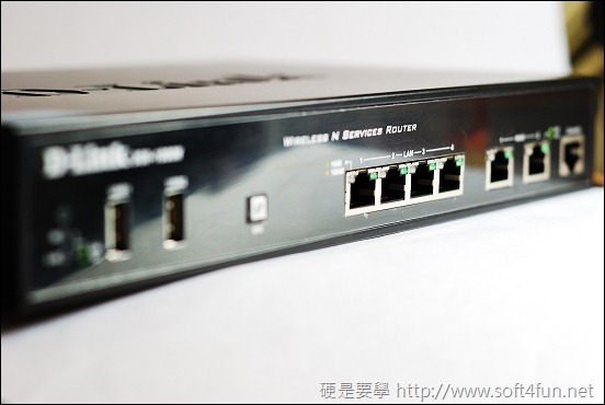 共有六組 RJ-45 網路孔,可串聯其他需要連網的設備。值得一提的是 DSR-1000N 提供了2組 WAN 介面來達到網路負載平衡的功能,也就是你可以同時將兩個不同的網路接到 DSR-1000N 上,一條20M光纖不夠快?那就兩條一起上吧!