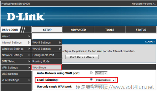 DSR-1000N 提供兩組 PORT 可連接網際網路,在後台提供選項提供管理人員設定是否啟用負載平衡的功能。負載平衡提供「Round Robbin」及「Spillover Mode」兩種模式,前者模式在建立網路連線時會自動切換不同的線路,後者則是當其中一條線路的頻寬使用率到達門檻值時,自動將流量導向另一條線路,避免塞車。