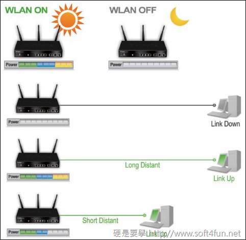 現在到處都在推行節能減碳政策,DSR-1000N 也不能缺席。DSR-1000N 會根據使用狀況動態的調整電源的使用量: 如果沒有裝置透過 DSR-1000N 連線的話,DSR-1000N 會切換至低電源模式等待連線。而若有裝置連上 DSR-1000N 時,DSR-1000N 也會根據傳輸距離的遠近調整電源使用量。