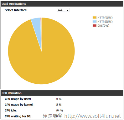 DSR-1000N 提供各種不同的統計圖表,管理人員可以透過各種不同的圖表,檢視網路使用的相關統計數據,也可檢視 DSR-1000N 的 CPU 及記憶體的使用狀況。