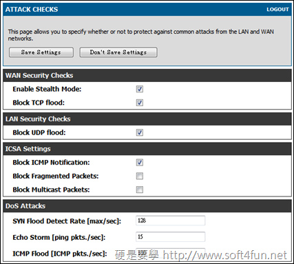 DSR-1000N 針對幾種在網路上常被使用的網路攻擊模式都有建立相關的判斷及防護機制,管理人員可以選擇是否讓 DSR-1000N 自動偵測這些攻擊,並且自動處理這些攻擊封包進入區域網路內,影響正常的網路使用。