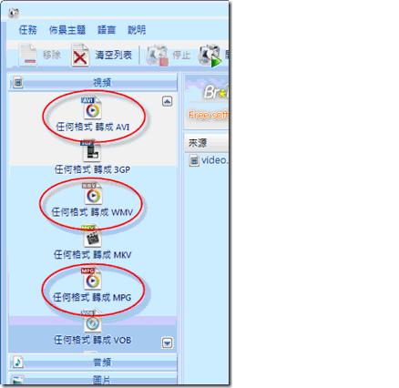 下載安裝後,執行「格式工廠」(桌面上的圖示名稱為Format Factory),選擇左邊的任何格式轉成AVI/WMV/MPG,將原本的下載影片(flv、mp4或avi)轉檔成方便編輯的影片格式,這邊建議用AVI或MPG格式。