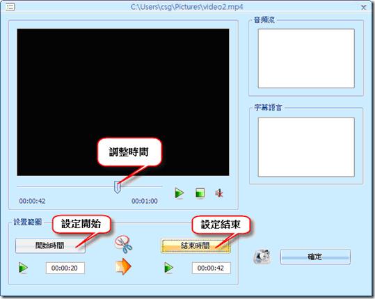 如果某些影片你只要擷取其中某個段落,可以在下方的檔案清單中,先點選該檔案,然後按下〔選項〕按鈕,便會出現一個預覽視窗,可以調整時間軸,並設定開始跟結束的時間。