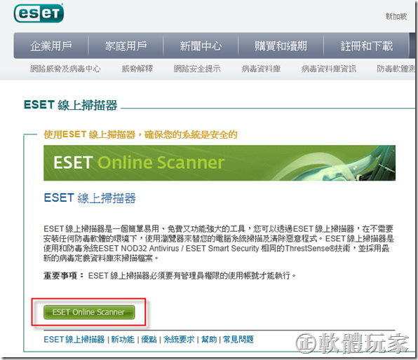 • 官方網站:http://www.eset.com.tw/threat-center/online_scanner