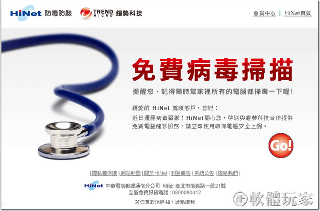 開啟Hinet免費病毒掃描網站,按下右邊的〔Go!〕按鈕即可下載掃毒程式。