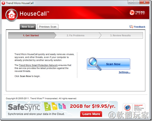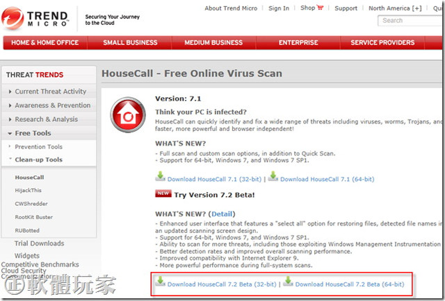 如果你希望試試趨勢本身的HouseCall掃毒服務,只要到HouseCall的官方網站,即可下載最新的7.2 Beta版(請注意有分成32及64位元)來幫你掃毒。不過該網站及掃毒工具的介面都為英文,使用起來可能會有點吃力。