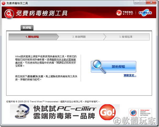 Hinet上面提供的是中文版的Housecall掃描工具,因此相當容易使用,如果有掃描到病毒還可以進行修復,是個相當好用的服務。