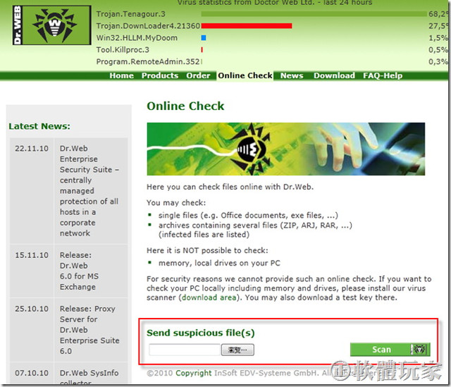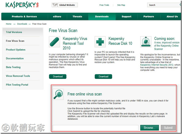 來自俄國的Kaspersky防毒公司相信大家都應該很熟悉,它的官方網站提供了線上單一檔案的掃毒服務,只要先按下〔Browse〕按鈕選擇要掃描的檔案(需<1MB),然後按下〔Submit〕即可進行掃毒。