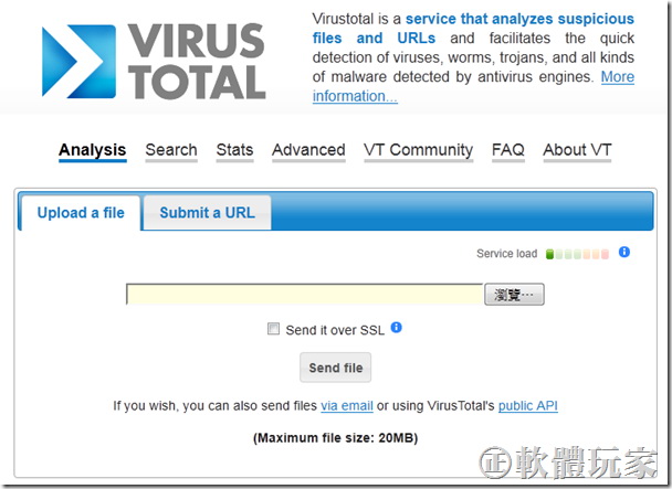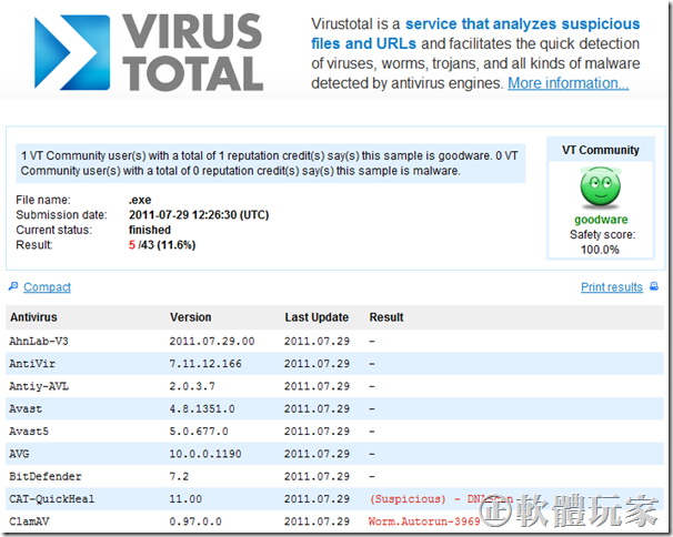 VirusTotal是個相當知名的線上掃毒服務,它使用了43種掃毒引擎來掃描你上傳的檔案,可上傳的檔案最大可達20MB,還會在掃描後列出所有掃毒引擎的掃描結果,提供給你參考。