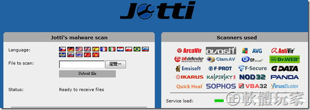 Jotti這個線上掃毒服務阿正老師也曾經介紹過,該網站內建了20種知名的掃毒引擎,而且裡面的病毒碼更新相當快,因此可以正確地判斷上傳的檔案是否有危險。不過由於Jotti使用的人數較多,因此有時候伺服器的負載會比較高,想要看到掃描的結果就需要等候一會兒了。