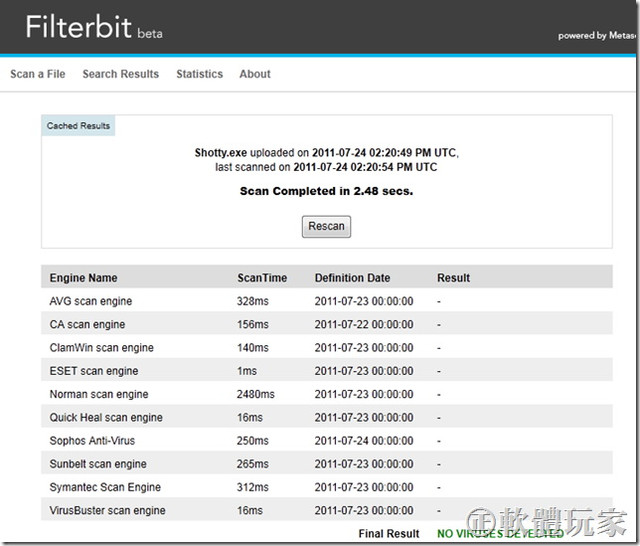 Filterbit是一個還在測試階段的線上掃毒服務網站,最大上傳檔案可達20MB,內建了10種掃毒引擎,不過病毒碼更新得比Jotti稍微慢一些。