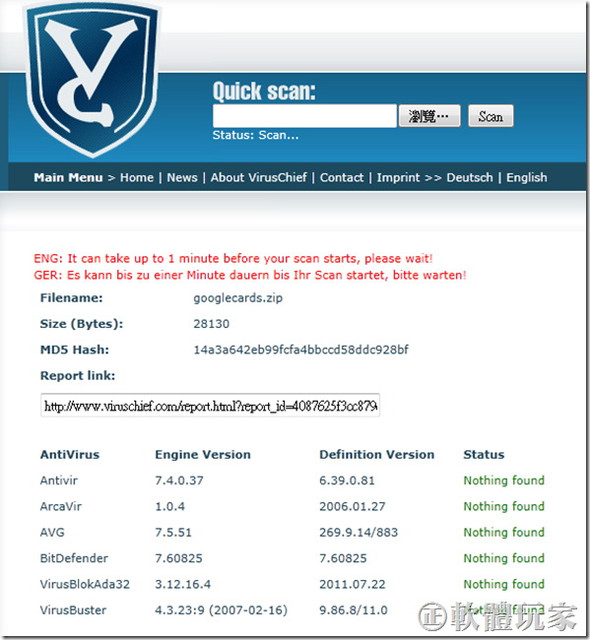 VirusChief是個德國的線上掃毒服務,內建了十多種掃毒引擎,病毒碼也更新得相當快,比較可惜的是有時候網站主機負載過重,必須等候一段時間才能夠進行掃描。