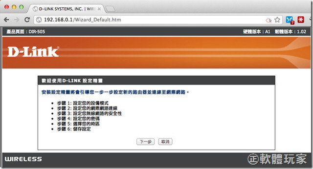 無線路由器模式的設定相當簡單,只要先找到DIR-505的SSID並連線(SSID跟密碼都印在隨機附的卡片上),再用瀏覽器打開192.168.0.1的網址,就可以進入DIR-505的管理後台,只要照著裡面的「設定精靈」逐步來設定即可。