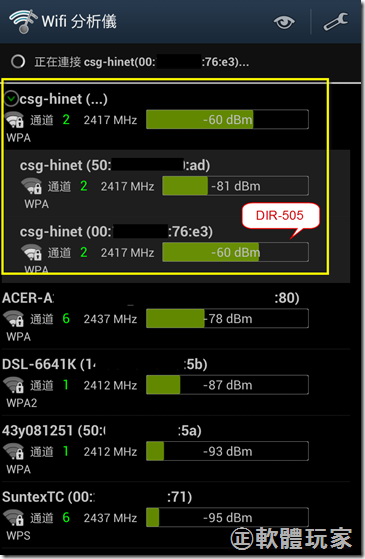 下圖是阿正老師用手機上的「Wifi分析儀」軟體來查看無線訊號,可發現同樣叫「csg-hinet」的基地台有兩個,下面訊號較強的那個就是DIR-505當成中繼器之後顯示的SSID。